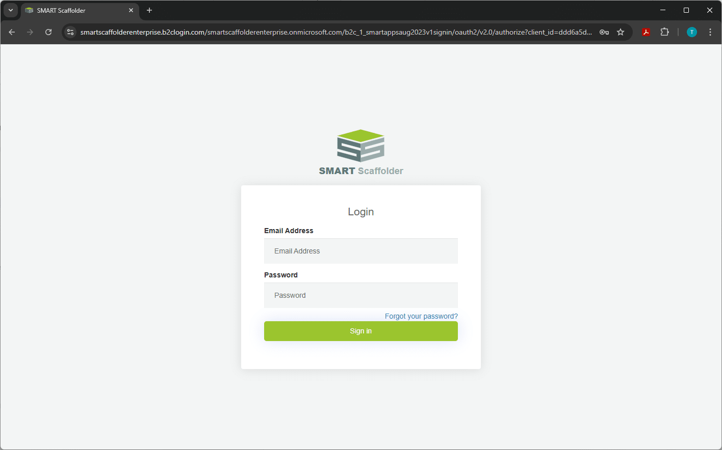 This is the same email address and password that you use to log in to other SMART Scaffolder software including SMART Estimator, SMART Manager, SMART Inspector and SMART Handover.