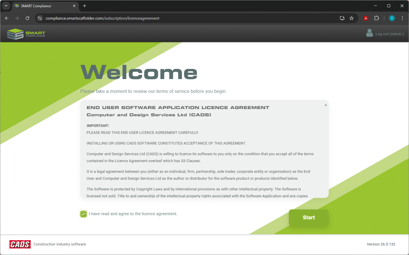 If you have not yet added SMART Compliance to your SMART Scaffolder subscription, you will be given the option, between the Welcome page and the End User Licence Agreement, to start your free trial.