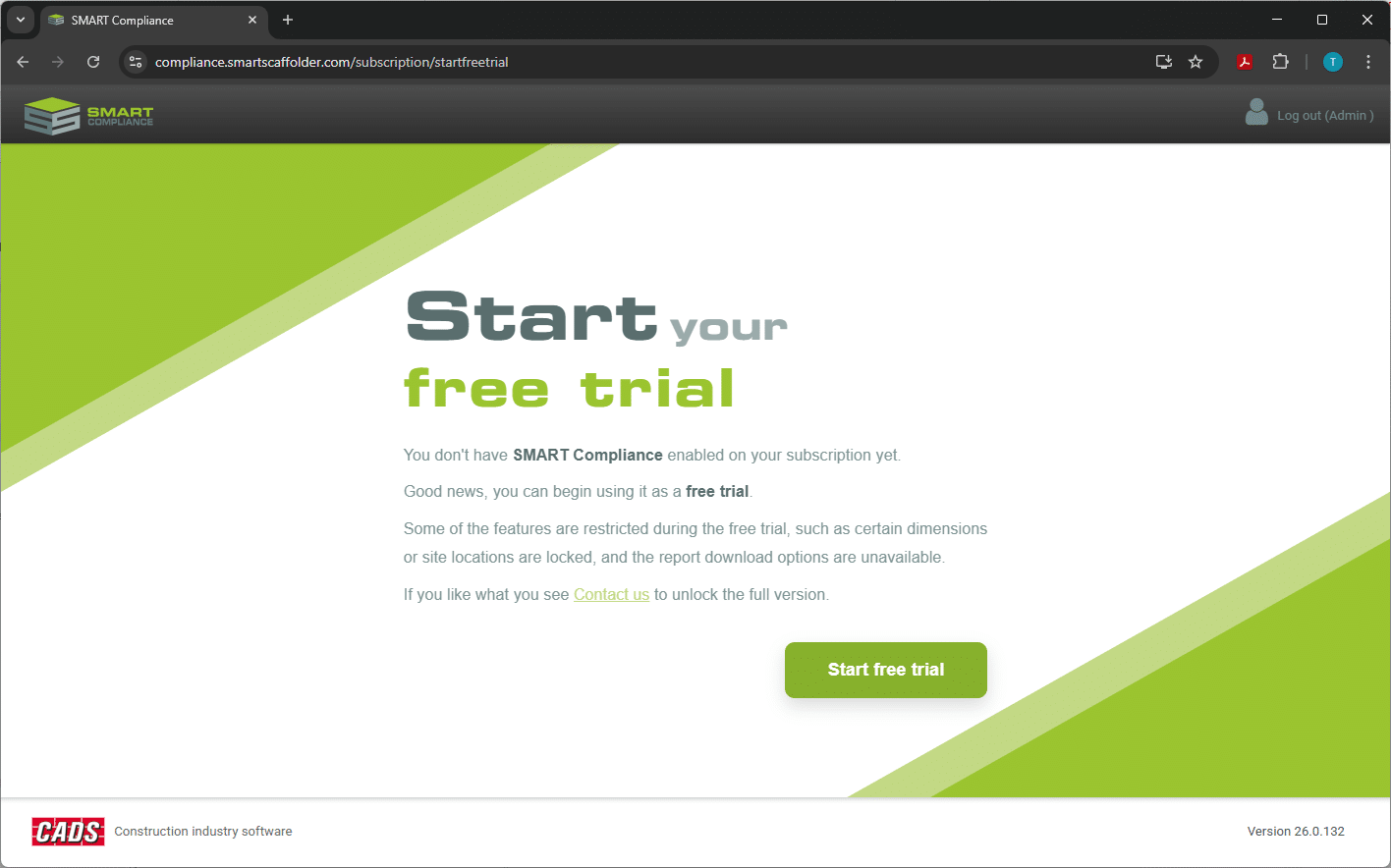 You will need to subscribe to SMART Compliance to unlock its full features. However, even if you haven’t subscribed yet, you can log in with any SMART Scaffolder account to try SMART Compliance in its Free trial mode.
