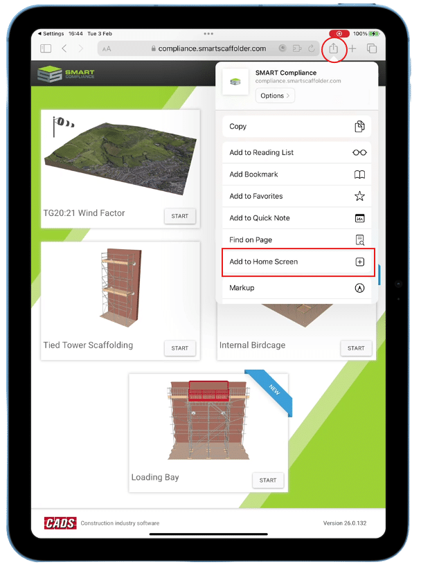 Once opened, you can save this link to your browser bookmarks, or you can install SMART Compliance to your device as an app, following the instructions in Installing to your device.