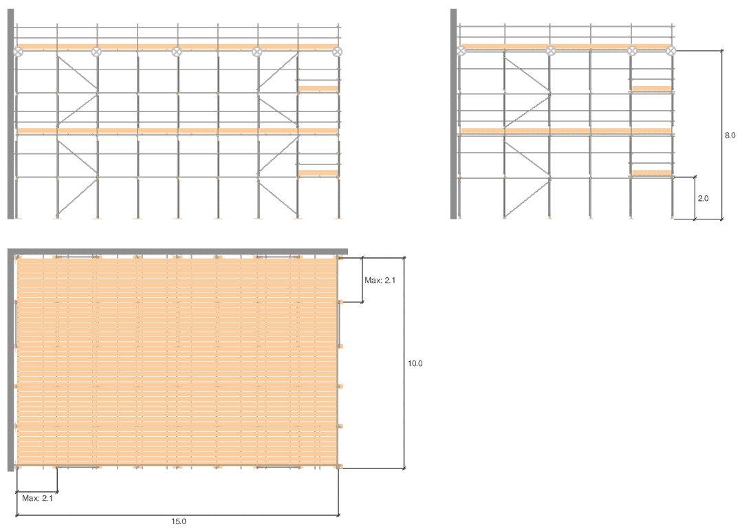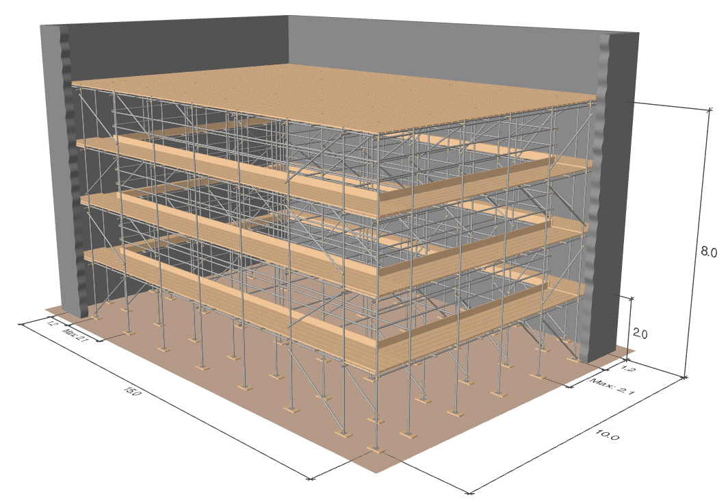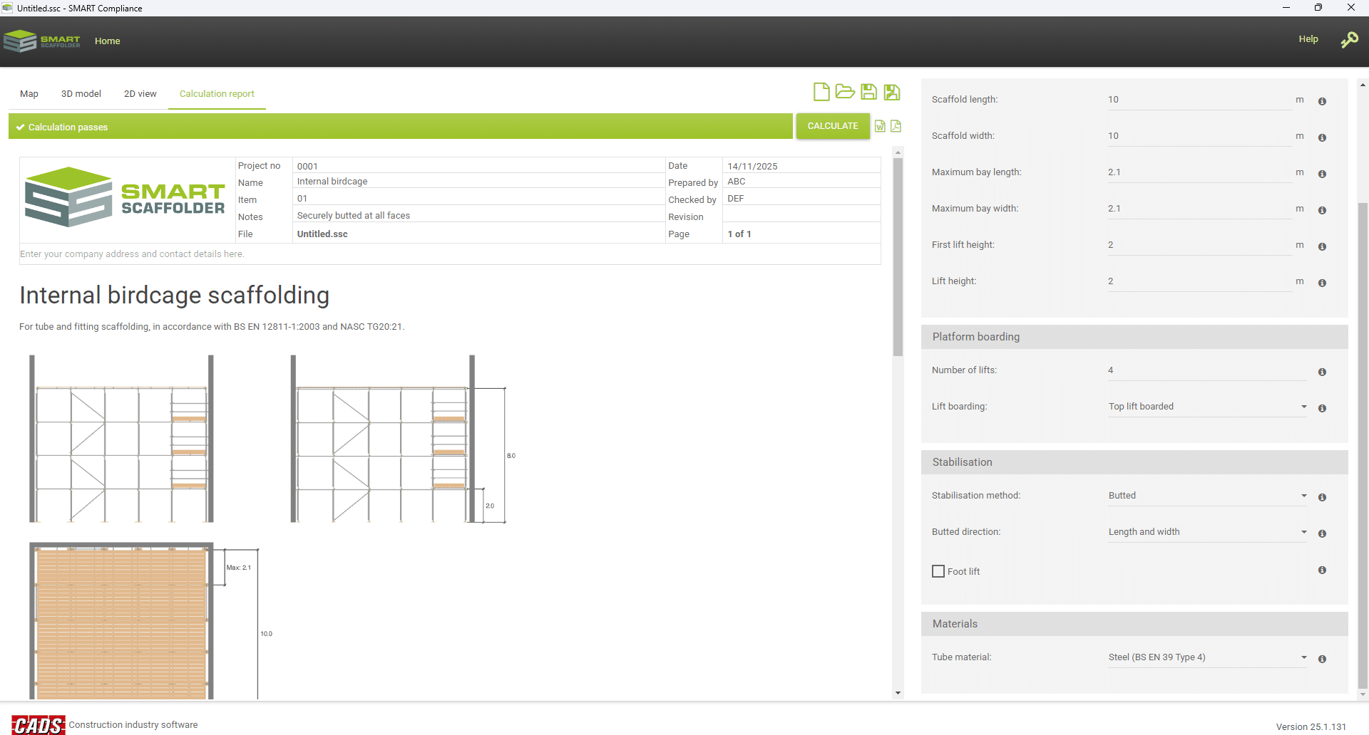 The software checks whether the scaffold is TG20:21 compliant, calculates the maximum leg loads for foundation design and, if the scaffold is tied, the maximum tie duty and required tie pattern.