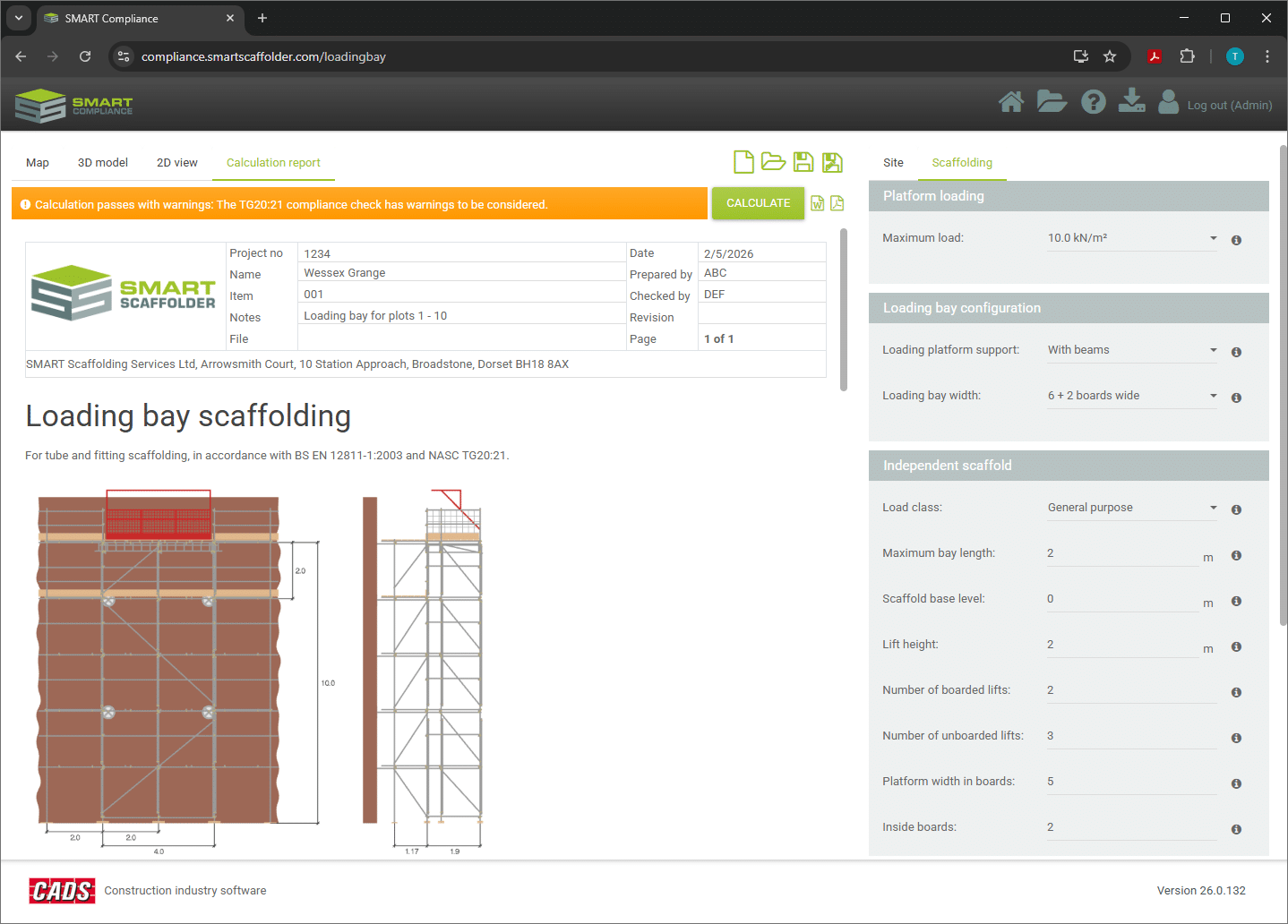 A summary report is provided when the calculations are performed, including the 2D elevations, the loading bay configuration and dimensions, the calculated leg load and tie duty, and the results of the TG20:21 check.