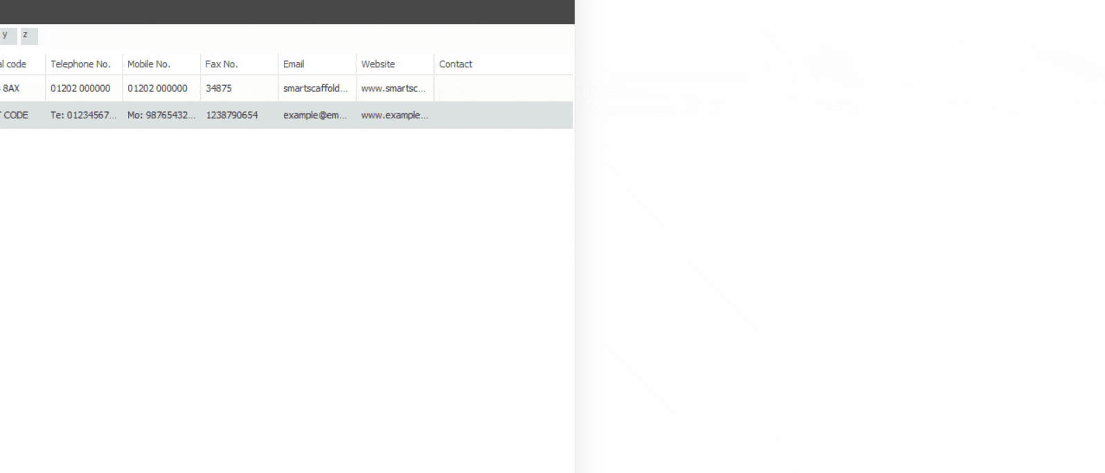 Now to access and edit the contact details, find the row that address relevant to the contact information. Now click on the contact-related cell within the row, this is located at the end of the row. A separate editing box will open automatically underneath with another table. To add a contact, simply edit the blank field and a new one will generate. Update the title, forename, surename, telephone number, mobile number and E-Mail. Once your contact is filled out, click on the cell before the title to enable them as the Primary contact. Click Ok and your contact has been saved for that address.