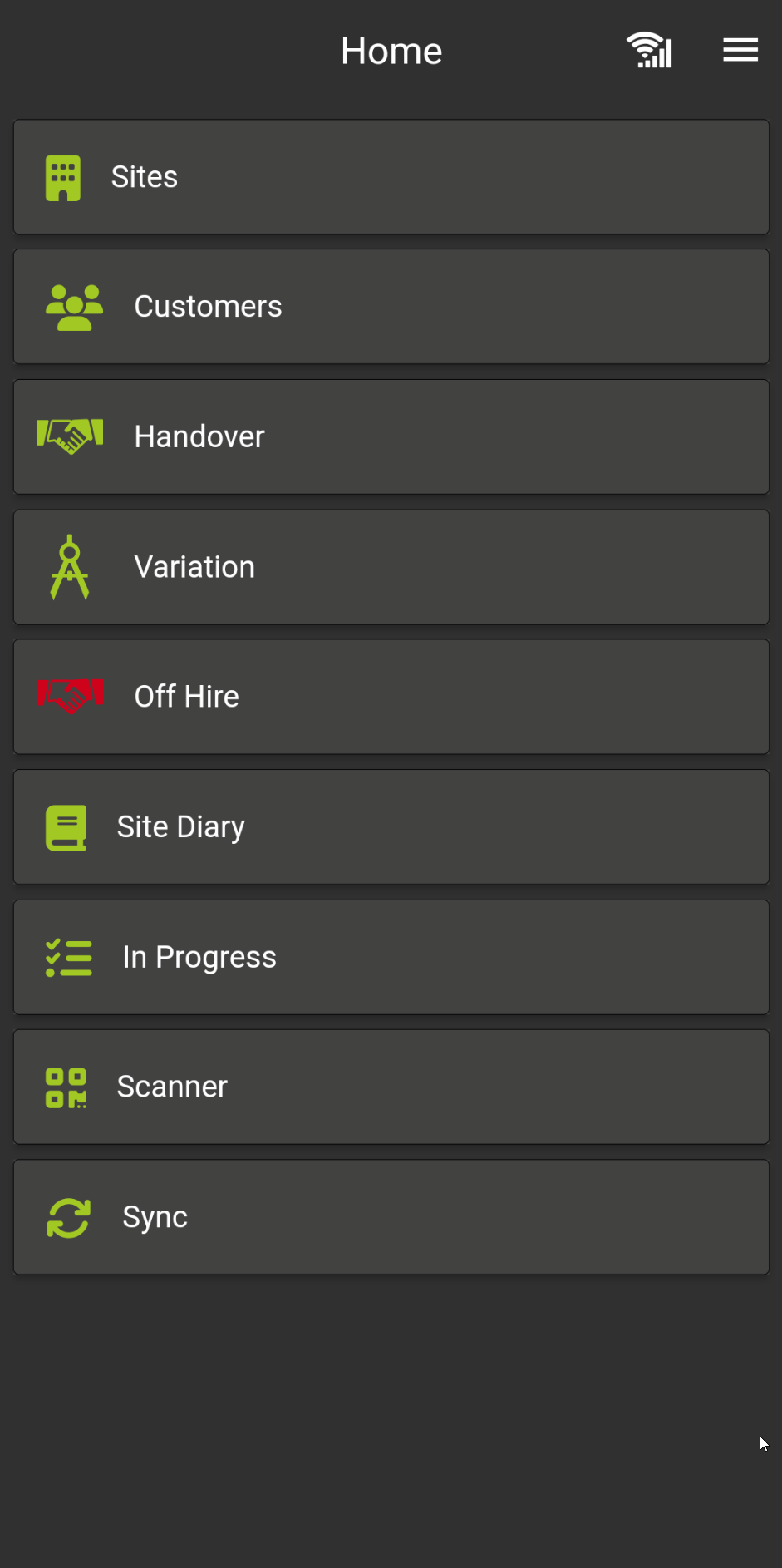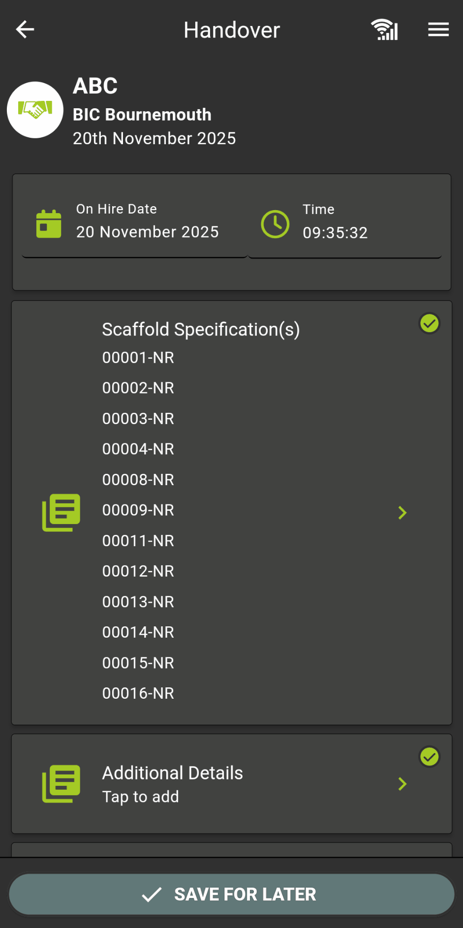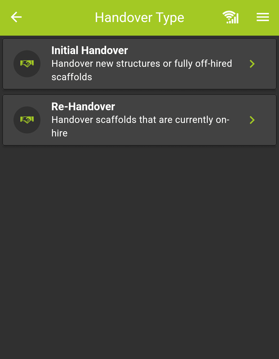 Select whether you wish to complete an initial handover for a scaffold or re-handover a scaffold already on-hire. When you click initial handover, it will show all scaffolds not currently on-hire, pick one to start the handover process.
