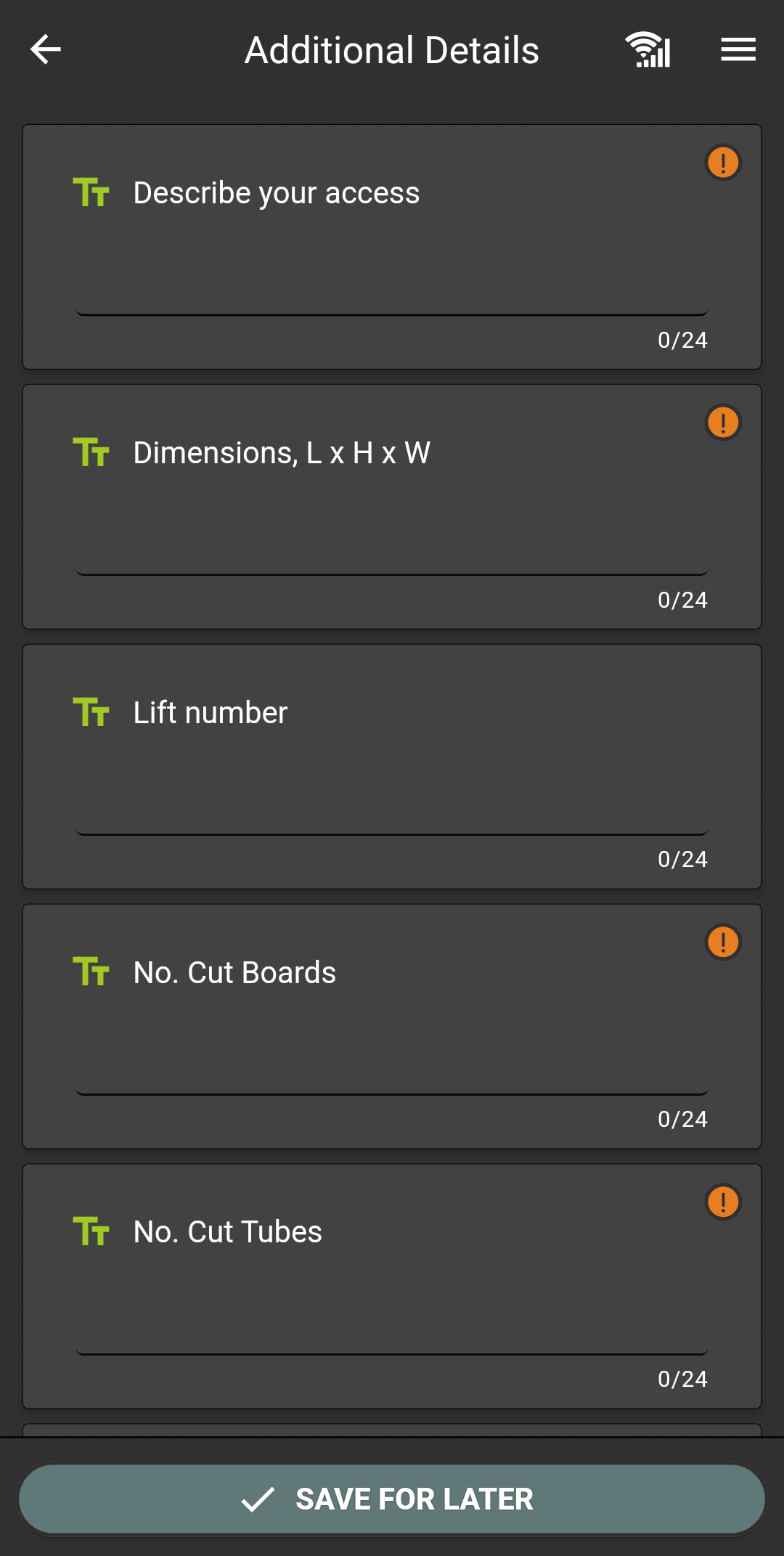 Complete all the highlighted fields or the software will not let you proceed. To speed up this process on-site you can add scaffold specs on SMART Manager from the comfort of the office, if you imported the scaffolds these should already be filled out. You need to complete the fields highlighted with an amber or red icon.