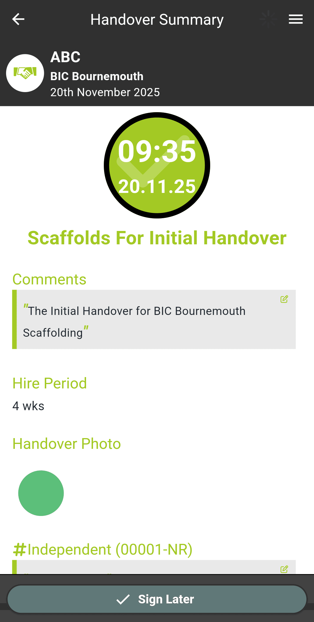Once signed the “sign later” button will change to “submit”, click this to complete the handover. This will be uploaded the next time the device syncs.