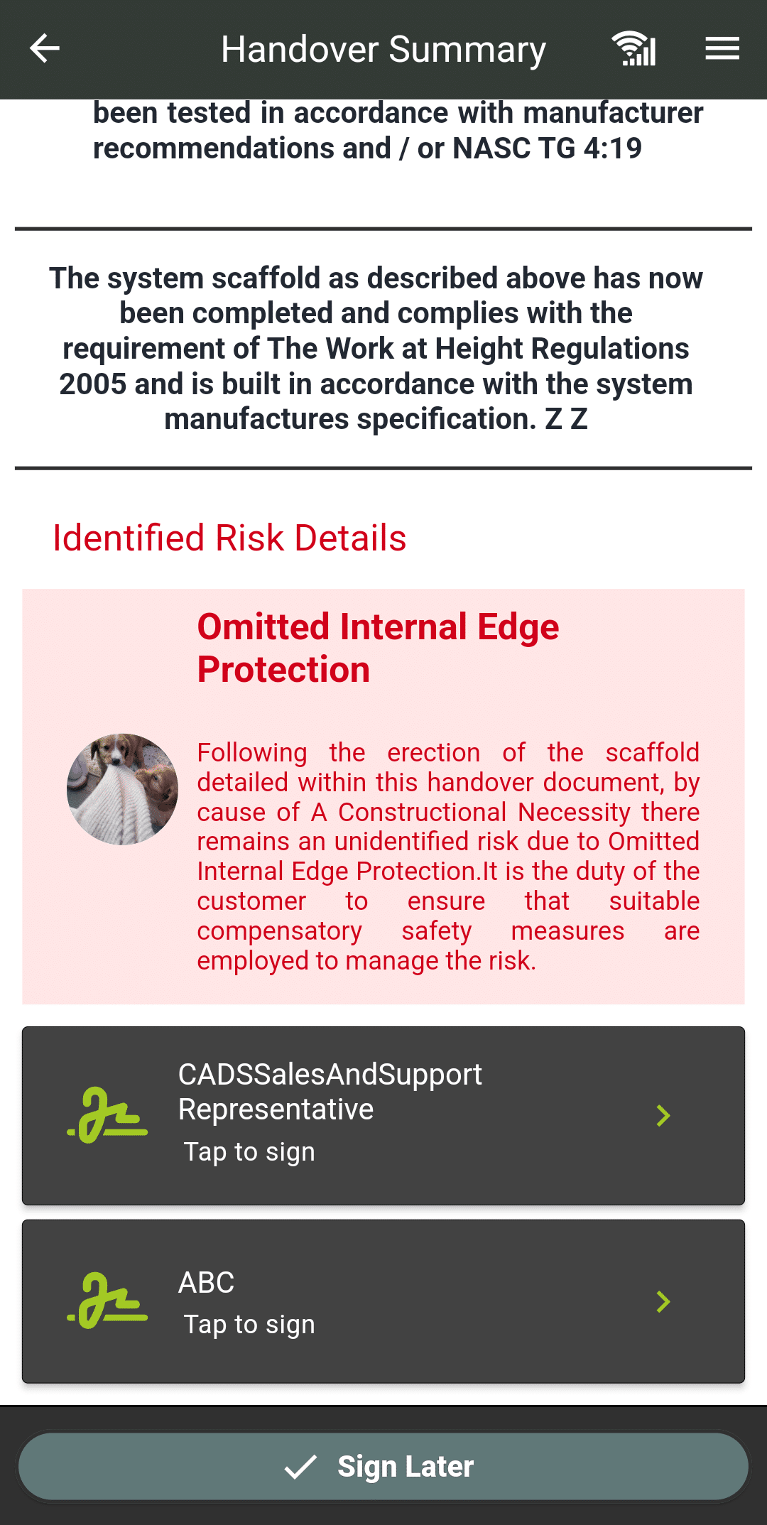 Here both the customer and the user must tap and sign before the handover can be completed. If the customer is not present you can click “sign later” this will save the handover in the progress section for you to re-open, sign and submit when the customer is present.