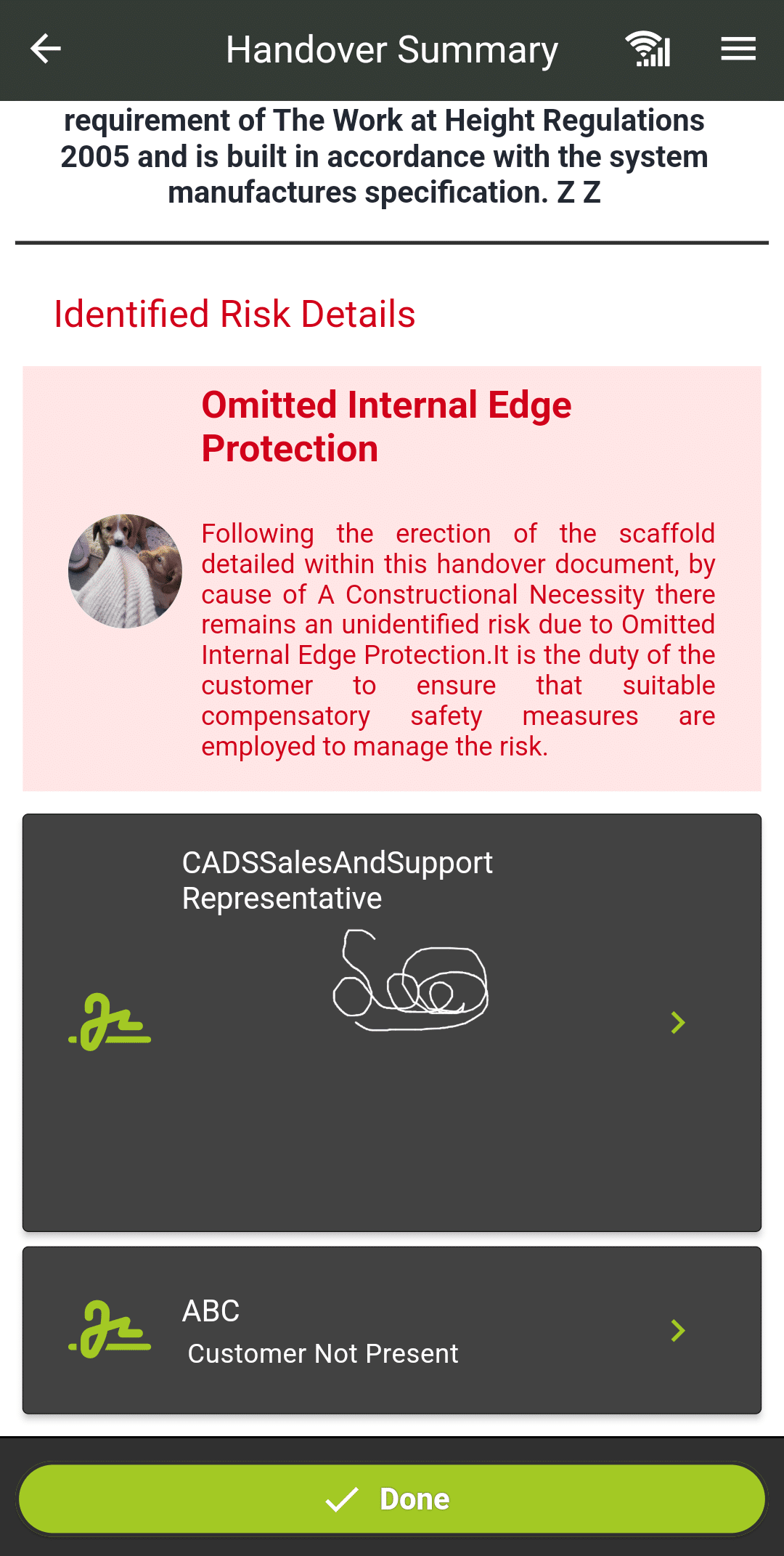 Please note the Inspection on the handover form is for detailing Identified Risks such as omitted guardrails.
