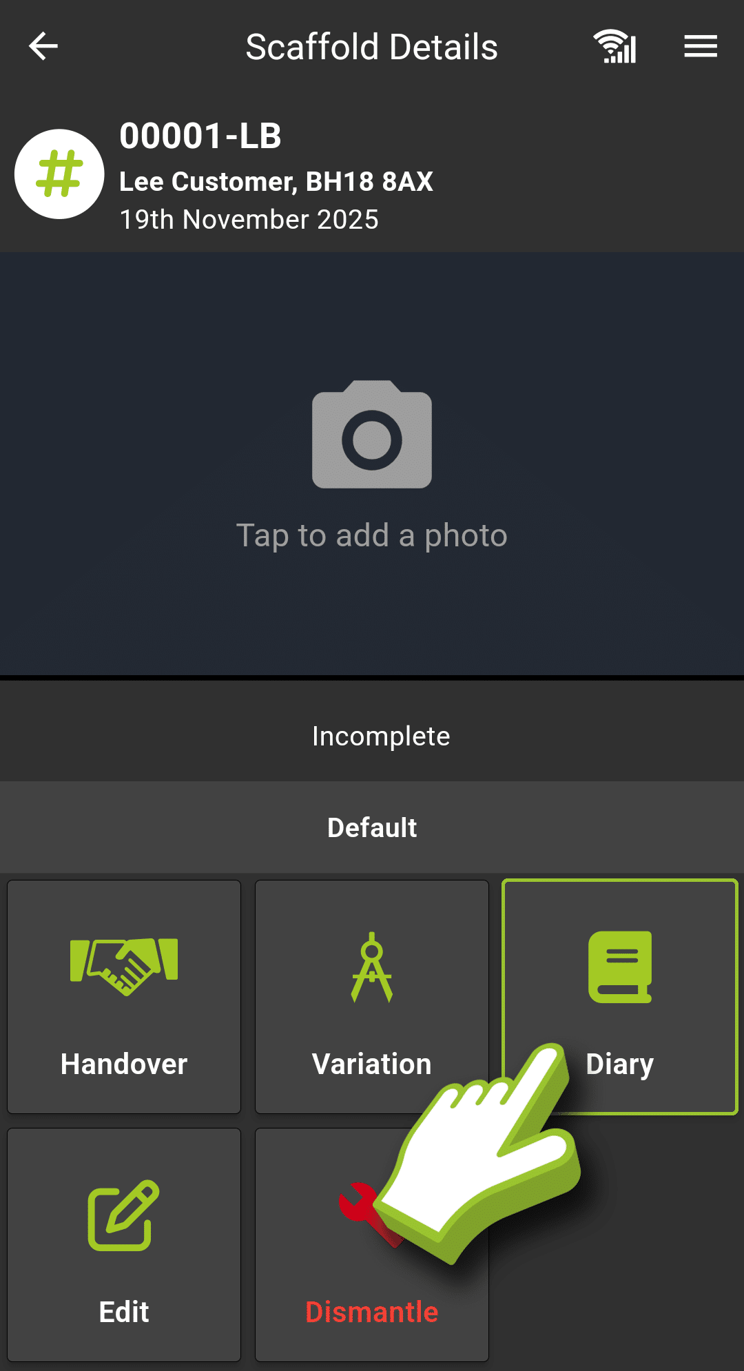 The Diary allows you to record entries into the scaffold diary, these can be written notes, video, audio or photographs. The app also allows an audio/video transcription function to allow users to dictate notes.