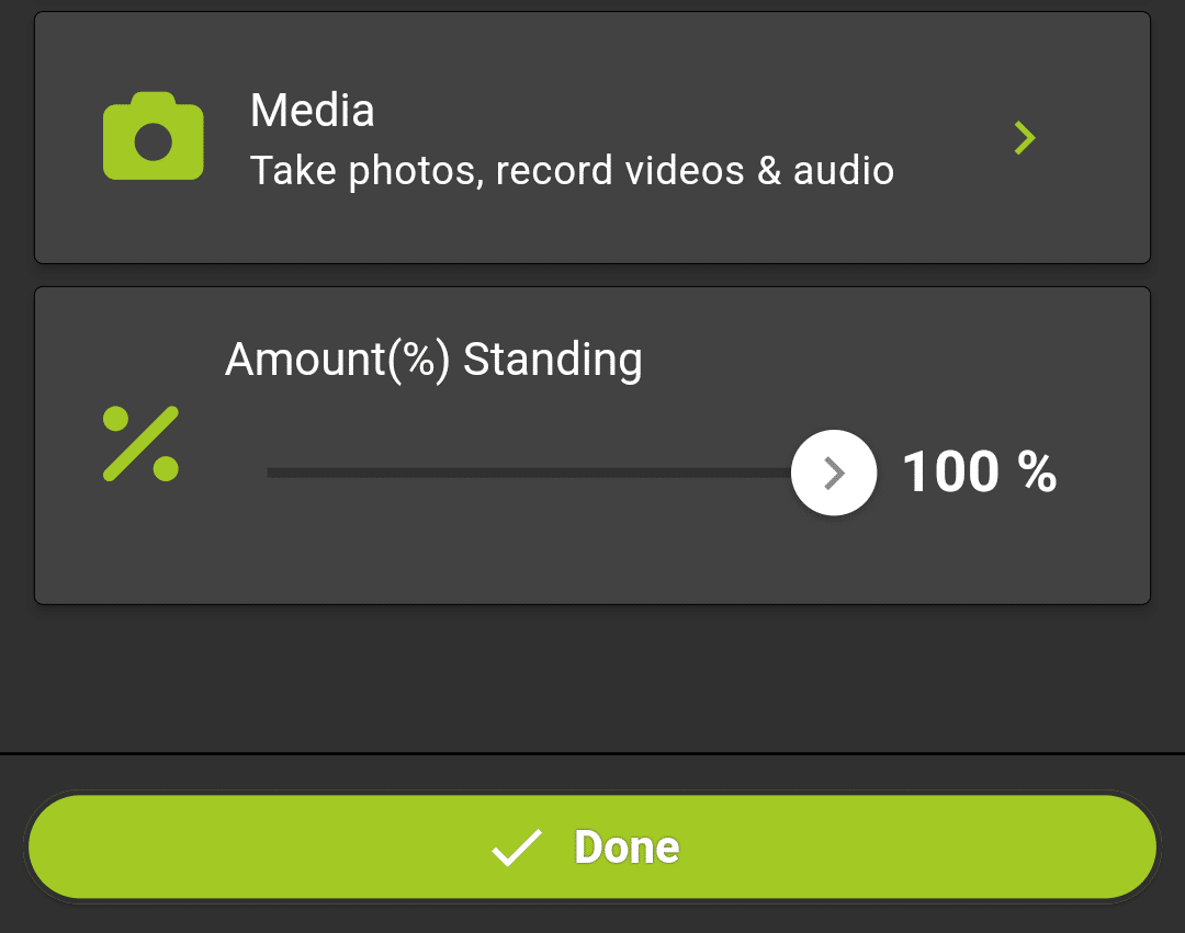 Now you can add a category, notes, media (audio/video with or without transcription) and set the % standing. Once complete click “Done”.