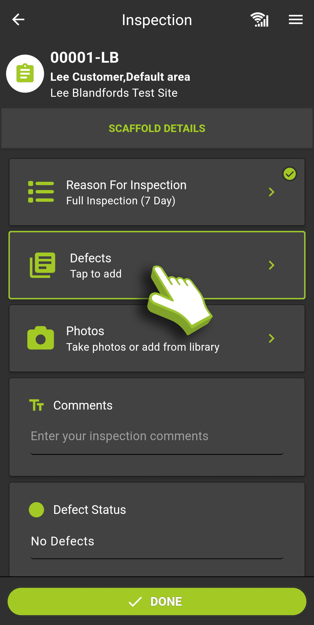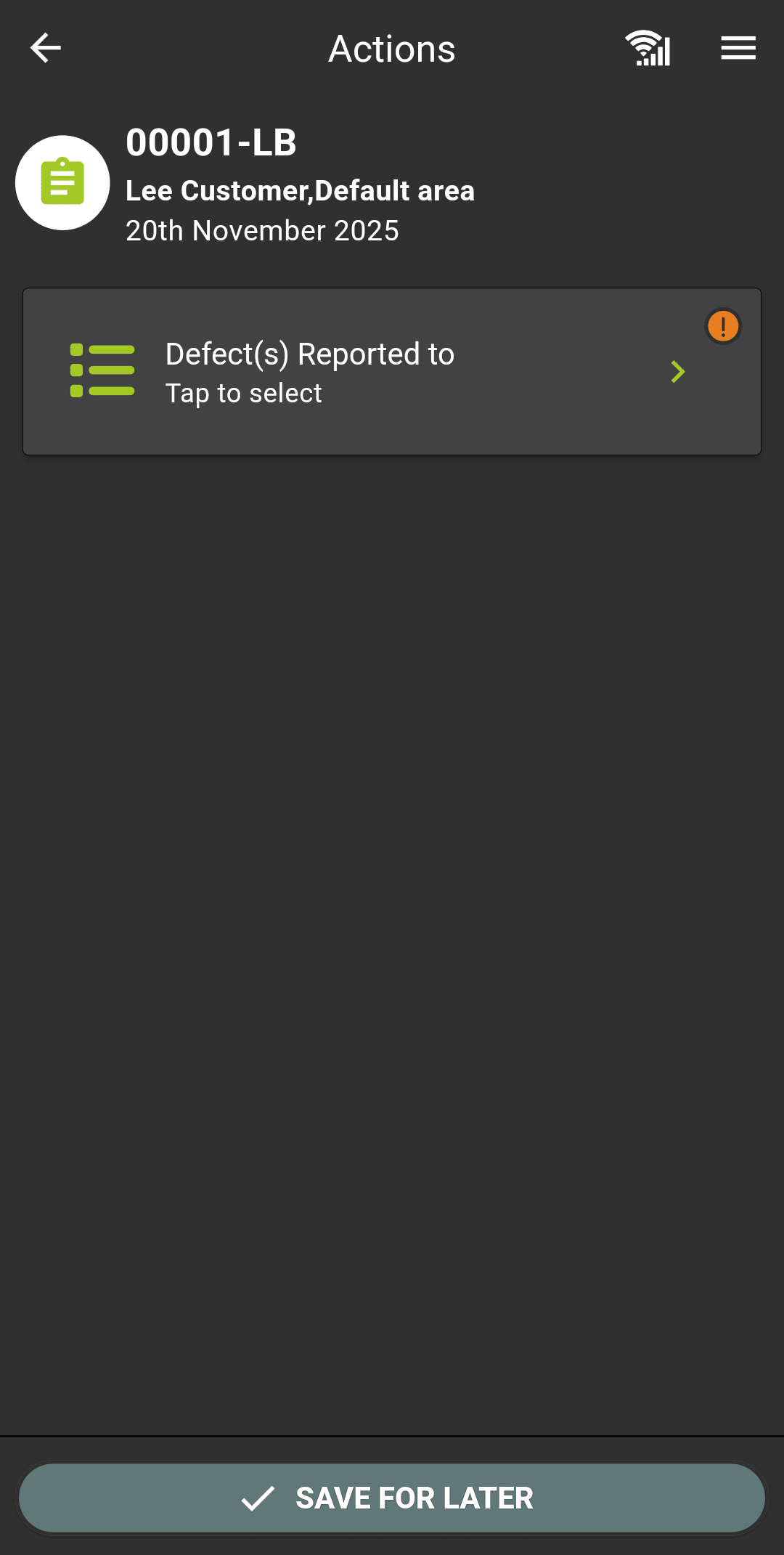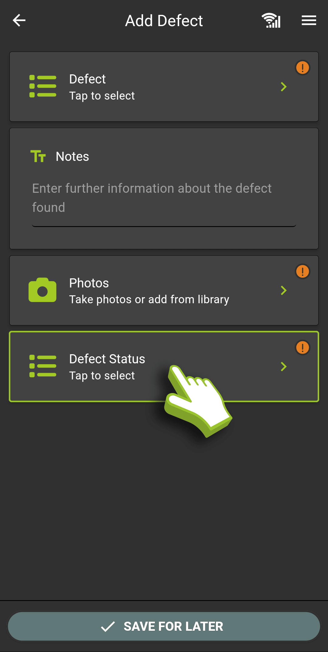 Click the Defect button in the inspection screen to open the defect list, then click add defect at the bottom of the screen. This opens the defect entry screen, ensure you fully complete all the boxes where the marker is highlighted orange, selecting defect type, attaching a photo of the defect and selecting a status.