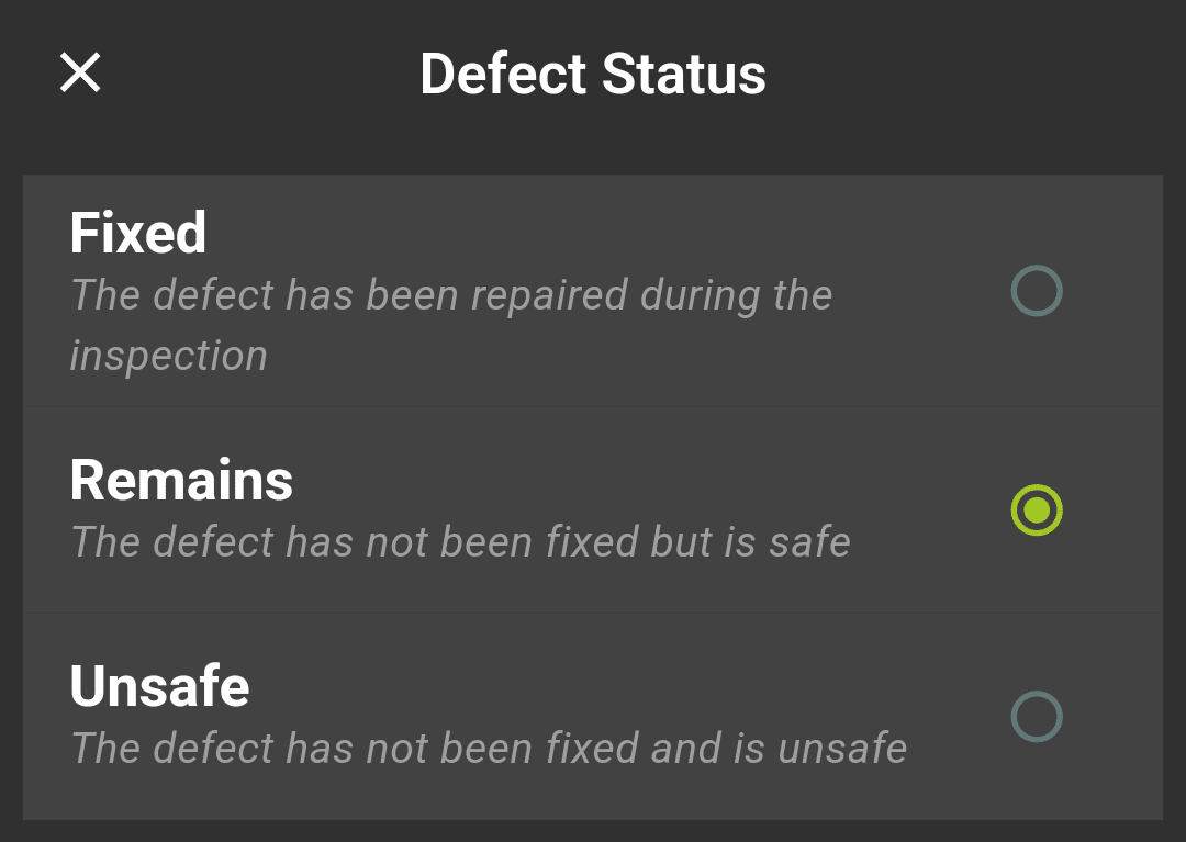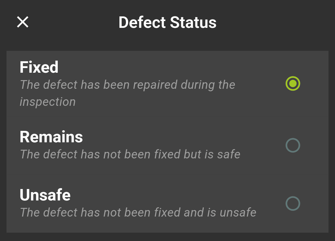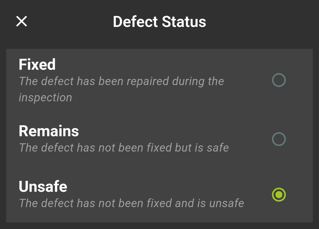 When adding a defect you must select a defect status, this will determine the outcome of the inspection and which follow up actions are required. See the status breakdowns and their follow up actions below.
