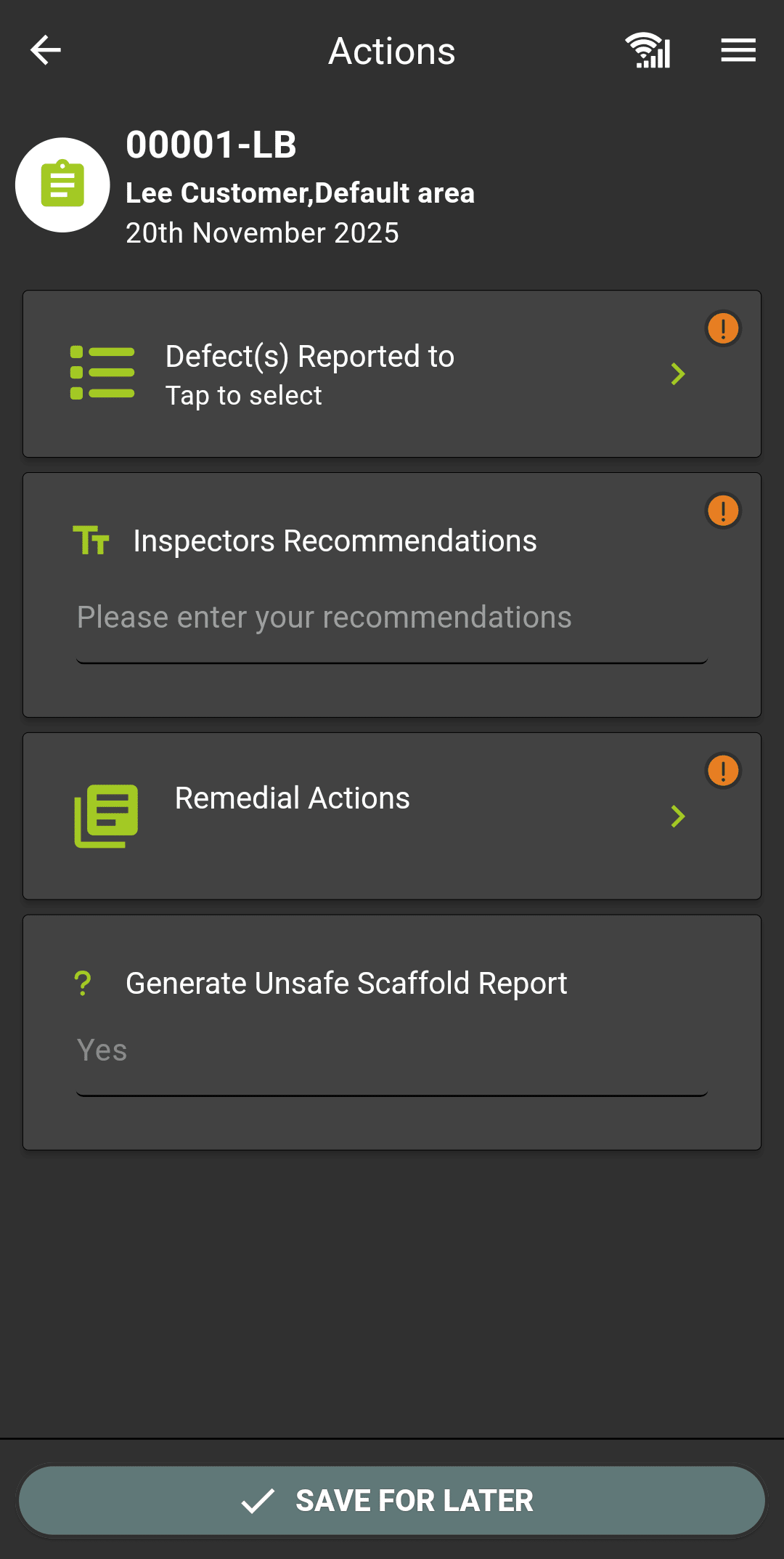 When you record a defect with the status unsafe, you are failing the scaffold inspection and marking it as unsafe until the defect is rectified. For scaffold inspections with unsafe defects the signature screen will highlight Red and you will be required to record the client contact the defects have been reported to, your recommendations and complete a remedial action report. You will also be able to produce an unsafe scaffold report (unlike normal inspection reports these send immediately and require client sign off).