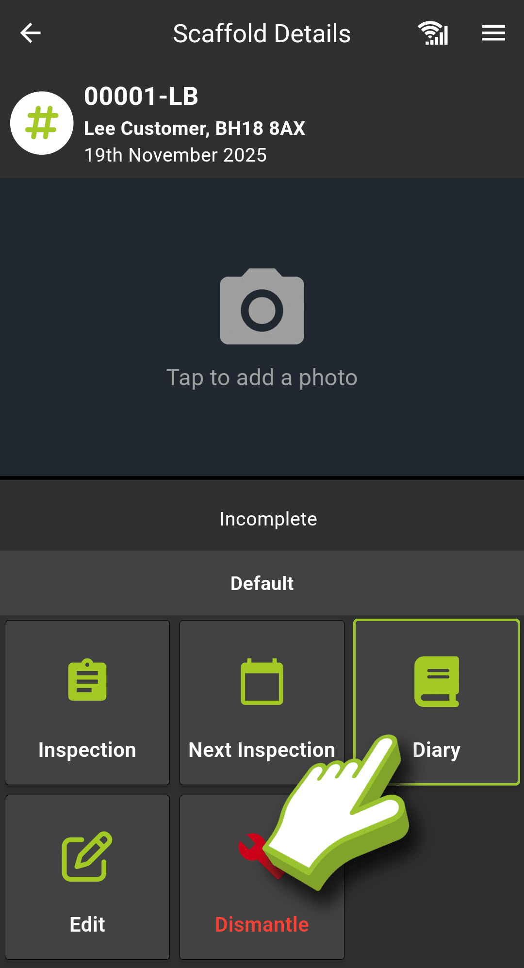 The diary entry will now be logged against the individual scaffold and the Site on SMART Manager.