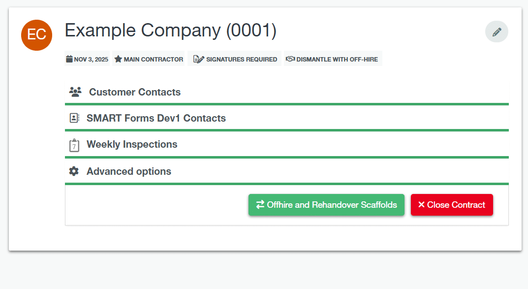 The Contract needs to have Scaffolds assigned that are ‘On-Hire’ before being able to utilise the Off-hire & Rehandover Scaffolds’ feature.