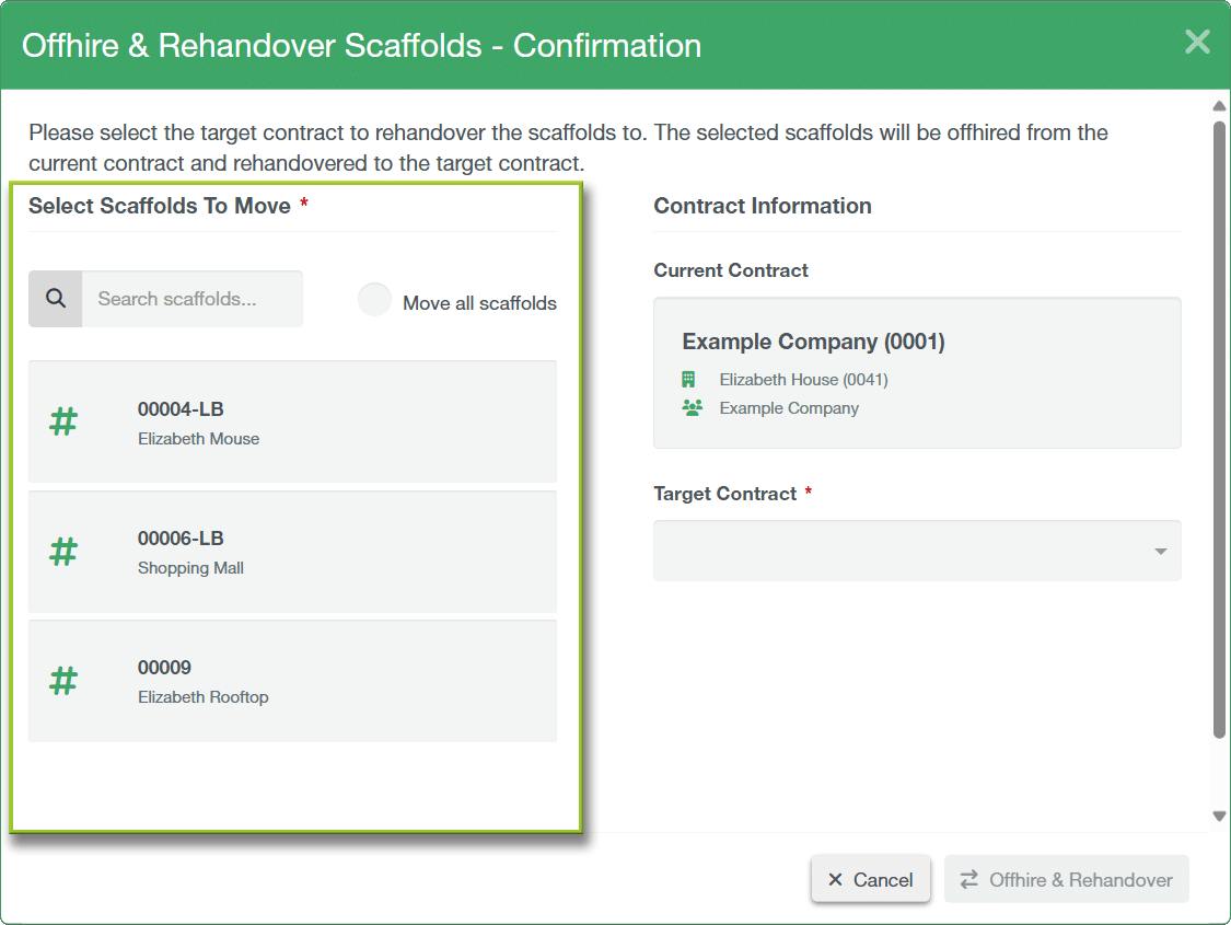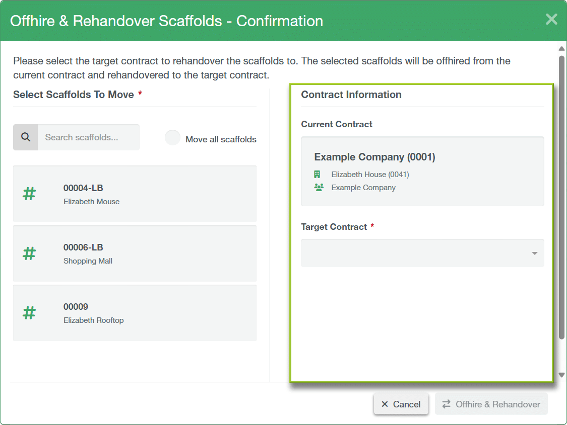 Once that’s done, click on the Offhire & Rehandover button. Once you confirm the action, the selected scaffolds are automatically offhired, rehandovered, and added to the target contract.