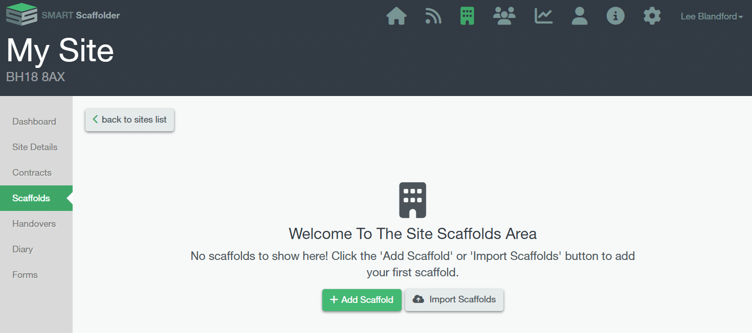 If this is your first scaffold, then you’ll need to click on the Green Add Scaffold button at the centre. Otherwise, click on the Plus symbol in the top right-hand corner of the section. This will open the “Add Scaffold” dialog.