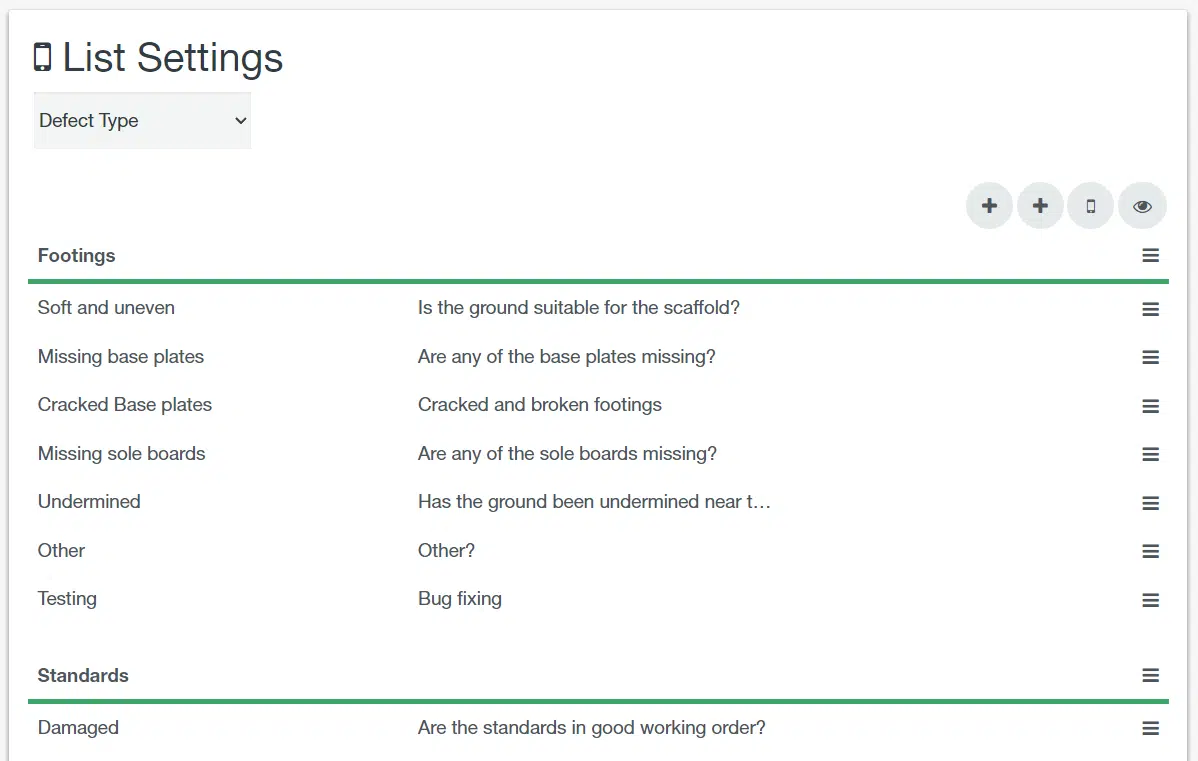 By clicking the menu icon at the end of each row, you can move items and groups up or down the list or delete them altogether. This allows you to rearrange the most common defects to the top of the list and save time for the inspectors when on site.